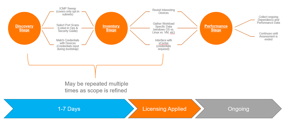 | Inventory Stage | During this stage the appliance revisits those “Interesting Devices” determined during the Discovery Stage using the matched credentials to gather workload specific data. All workload specific data is then compressed, encrypted, and uploaded via a secure SSL connection to the RISC Networks’ SCE. At the end of the inventory phase a populated asset report and licensing page will be available in the RISC Networks portal. The user can then select devices within the licensing page that will move on to the Performance Stage. This ends the Inventory Stage. |